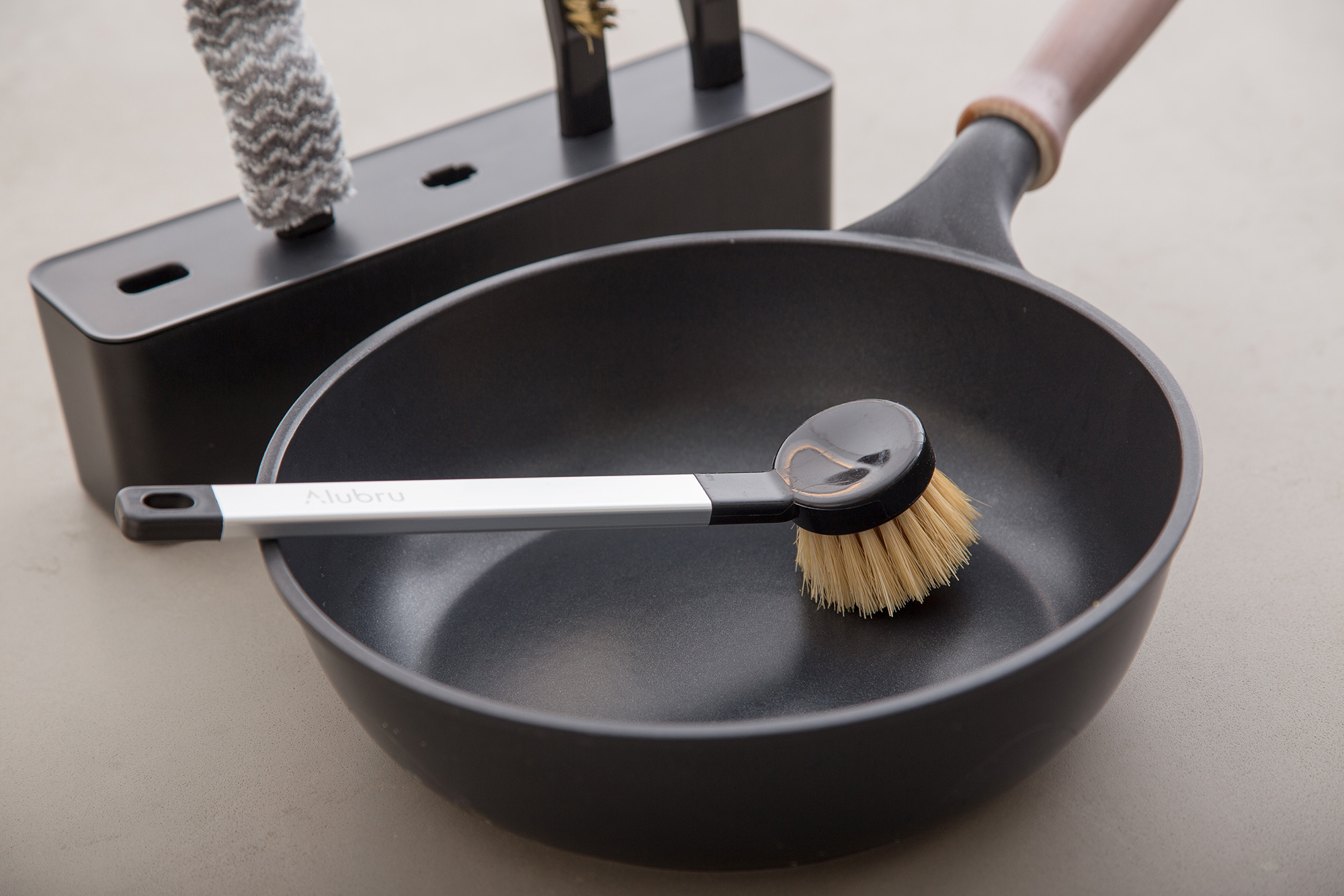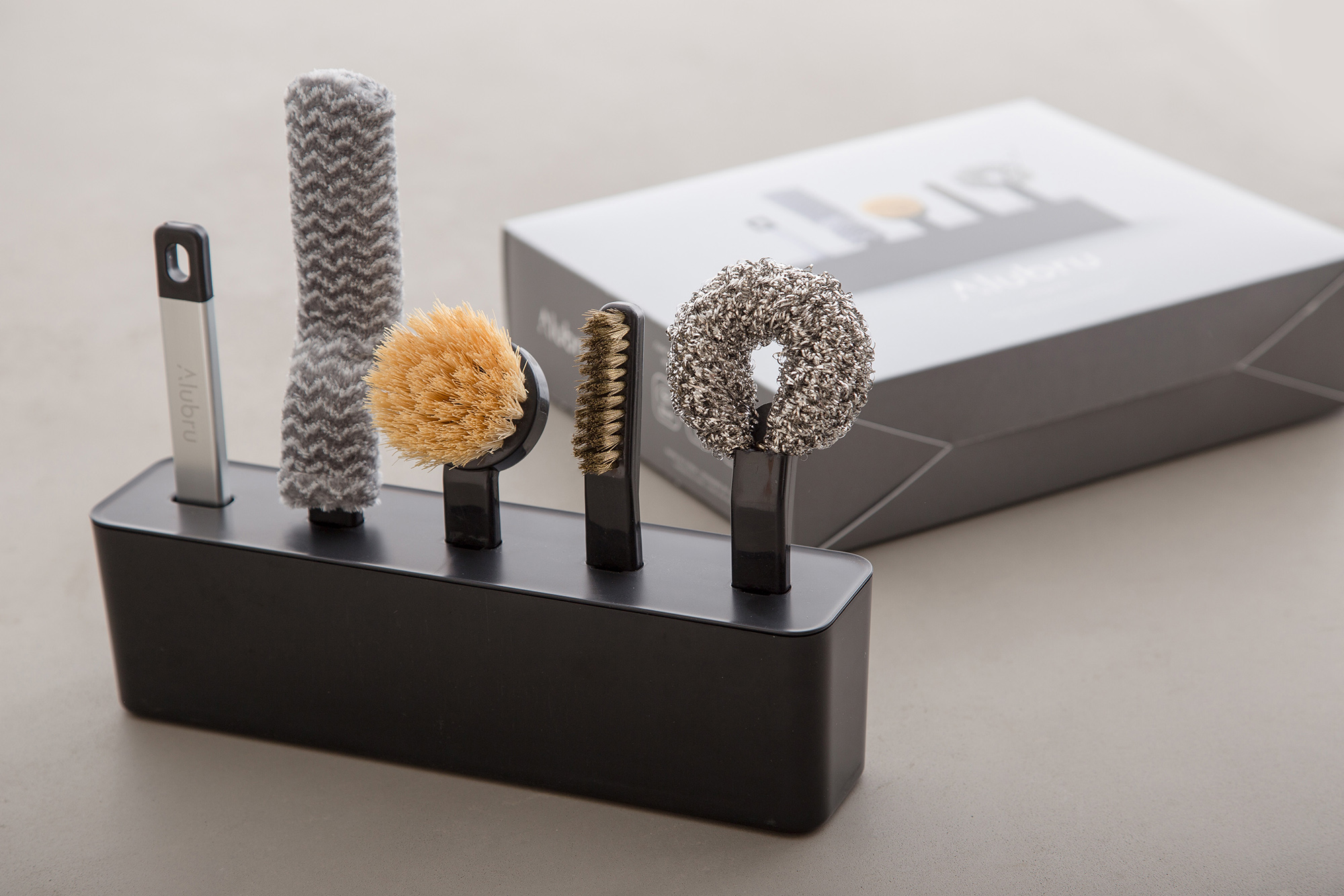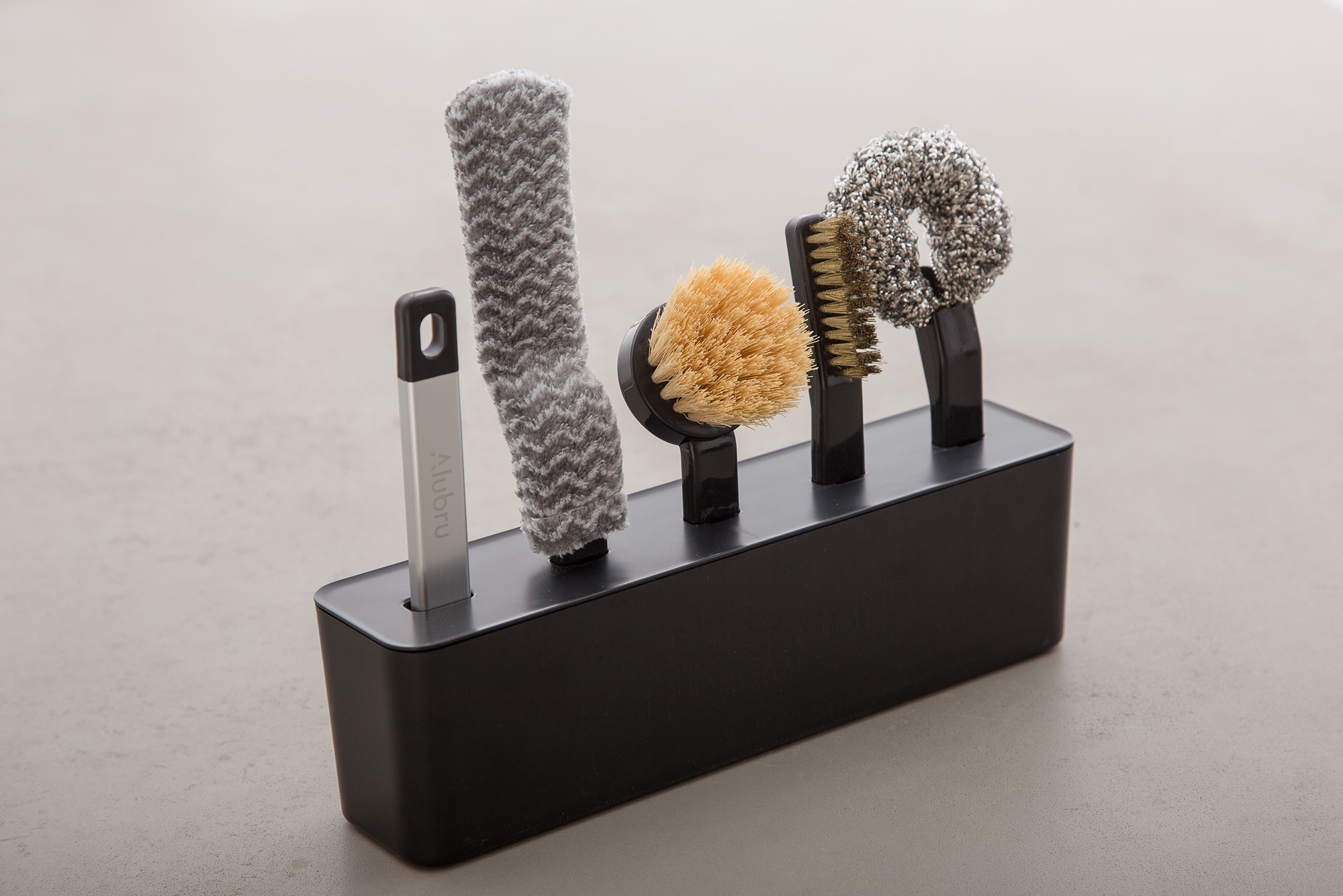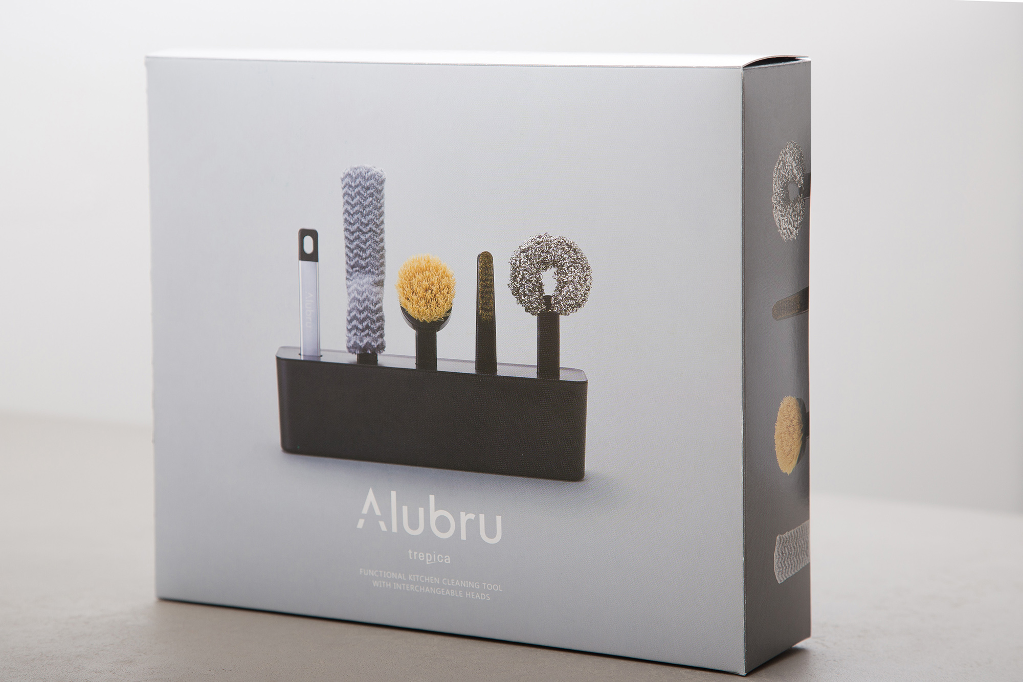 ALUBRA Description アイセンインダストリアル株式会社様の海外向けキッチン清掃シリーズ 『ALUBRA』のプロダクトデザイン、パッケージデザインの事例です。 共通のアルミグリップを使い、用途に合わせてヘッドを付け替えて使用。 保管場所に困るブラシ類をスッキリ収納できるボックスがセットになっています。 海外向けでしたが、スッキリしたデザインが好評で国内においても展開を開始しています。 Category ProductPackage/Graphic Material ABS/PP/アルミ 製造方法 成形