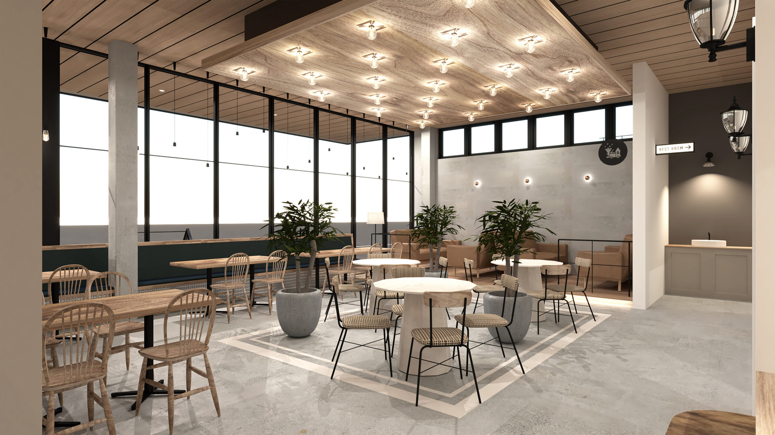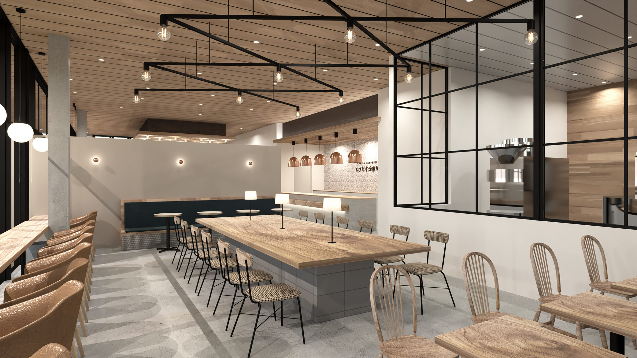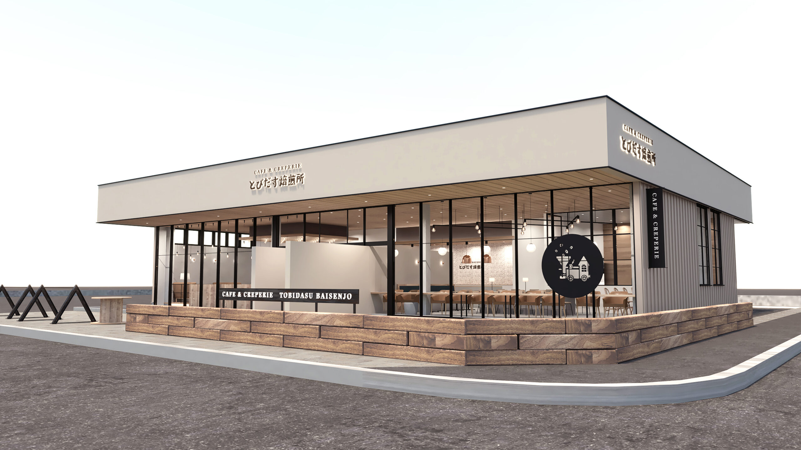 とびだす焙煎所 Description とびだす焙煎所様の新規カフェの店舗デザイン 汽車モチーフのロゴデザインを含め、店舗の外装・内装デザインをトータルで手掛けました。グレイッシュな中間トーンの色調や素材を組み合わせ、落ち着いた居心地の良い空間に。周辺地域では珍しいガレットをご提供するカフェとして、独自の世界観を目指しました。 https://tobidasu-cafe.com/ Category Branding/PlanningSpaceTotal Design